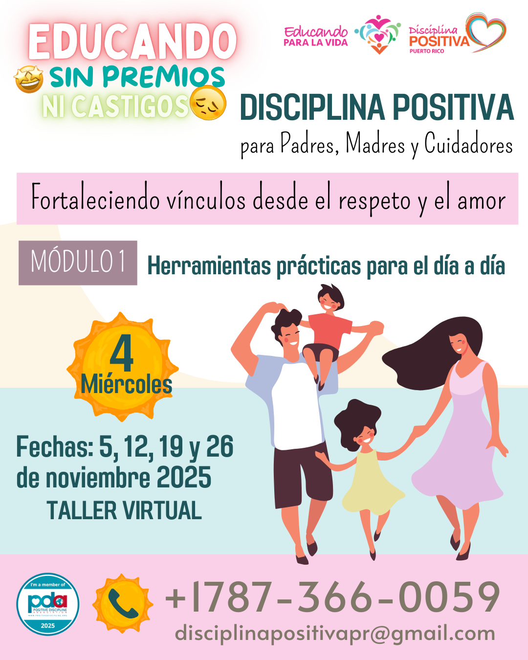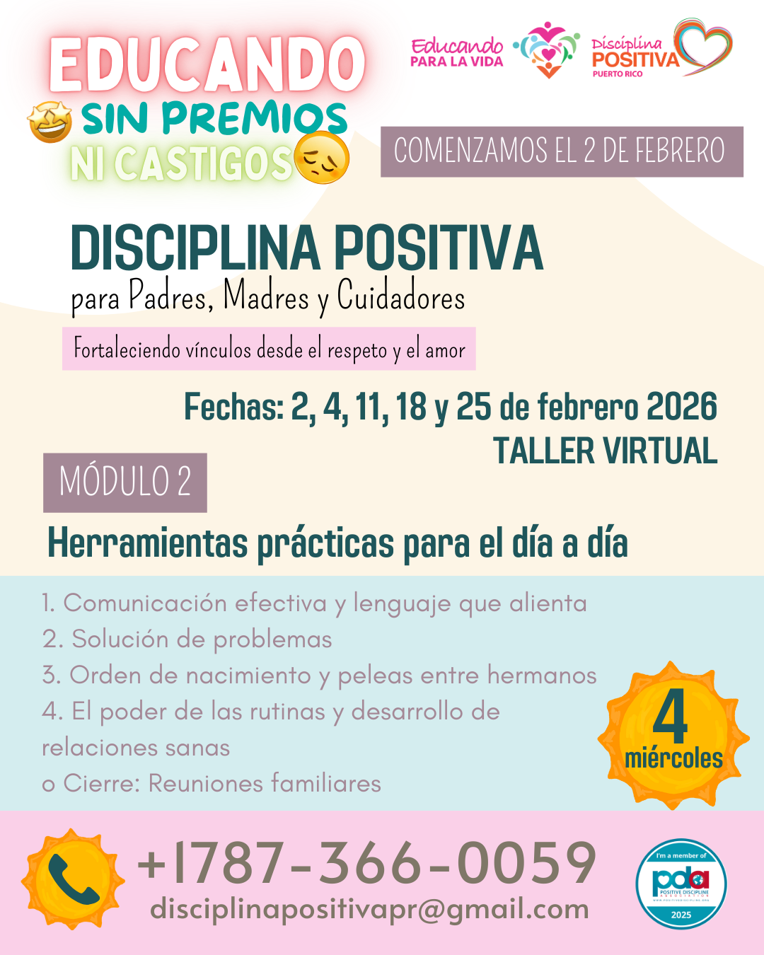 Para más información puede escribirnos a disciplinapositivapr@gmail.com o por WhatsApp al 787-366-0059.